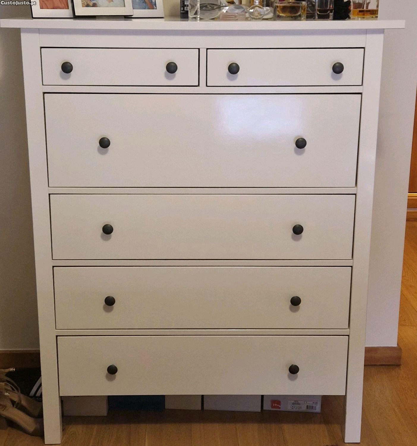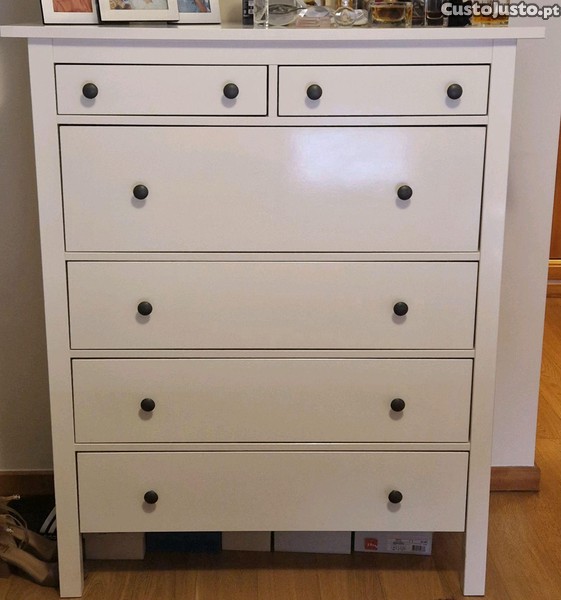 Comoda branca com 6 gavetas. Medidas indicadas nas imagens. Estado com pouco uso, como nova. Gavetas reforçadas. Preço nova 249. Transporte a cargo do comprador.