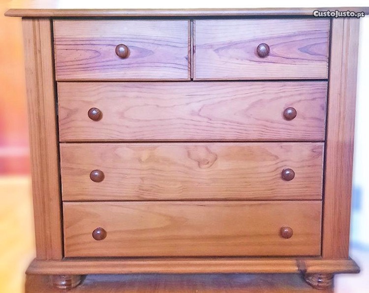 Pode ser utilizada em quarto de dormir, em hall de entrada ou até num escritório, é muito versátil. É em madeira maciça de excelente qualidade. Possui 2 gavetas no cimo e 3 gavetões por baixo, com uma estrutura muito robusta. Os puxadores, também eles são em madeira, ao estilo botão. Os pés são boleados e muito sólidos. Com linhas muito sóbrias e discretas, enquadra-se em decorações mais tradicionais ou mais modernas com muita naturalidade. Possui muita arrumação.
