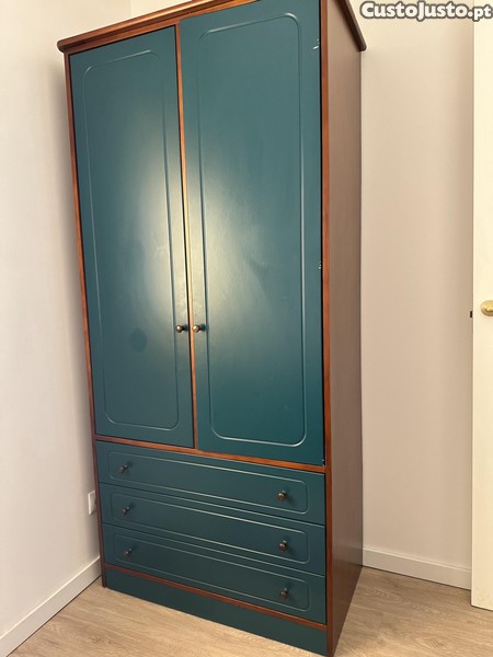 Não sei o material específico do conjunto, mas os puxadores e alguns detalhes da cama são de cobre. Na cama, apenas a tábua do estrado está ligeiramente danificada num dos cantos. No roupeiro, na última gaveta, o suporte da roldana está partido, mas a gaveta abre até mais de metade.