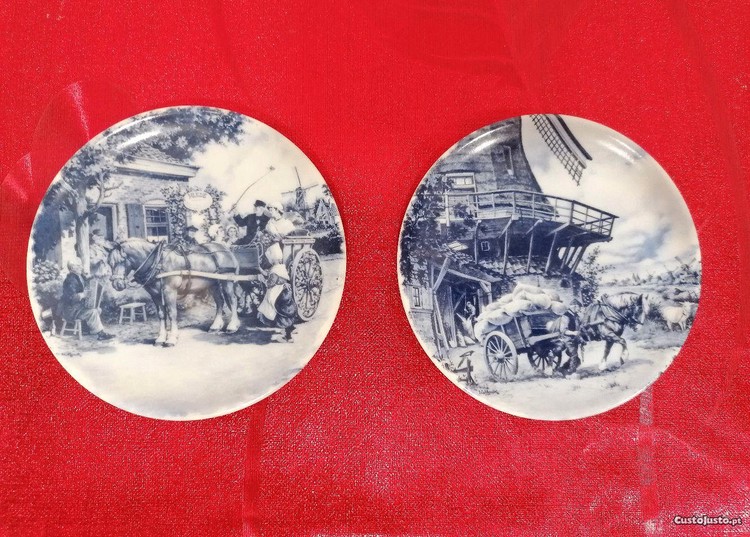 Conjunto de 2 pratinhos de coleção em porcelana azul holandesa.