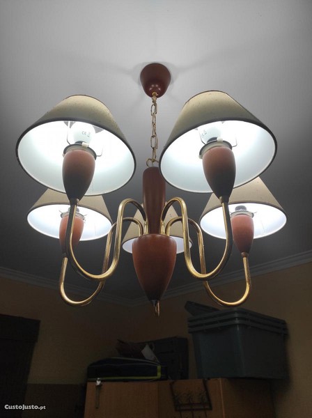 Conjunto de Candeeiros de Quarto, em cerejeira. Candeeiro de Tecto com 5 lâmpadas e 2 candeeiros de mesa de cabeceira. Todos a funcionar e em bom estado.