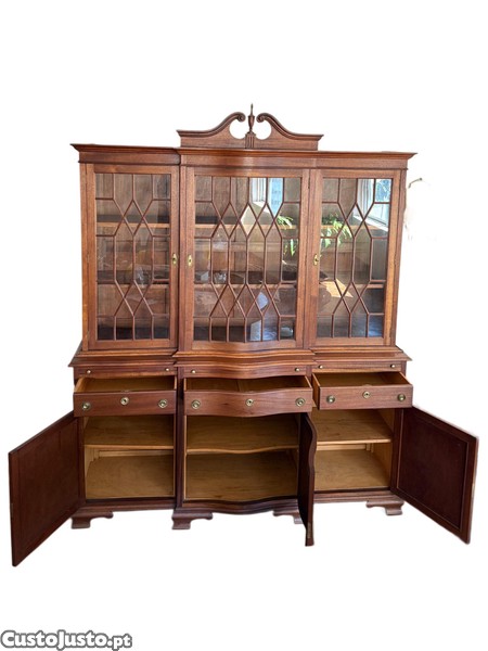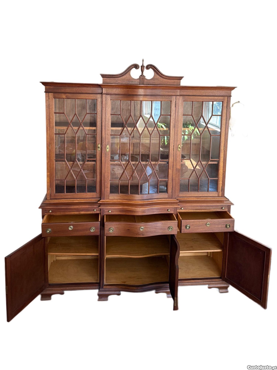 Vendo móvel antigo de sala de jantar em madeira maciça de qualidade, trabalhado no estilo inglês Georgian. Peça robusta e muito elegante, com mais de 70 anos, composta por base e vitrine superior destacável para transporte.