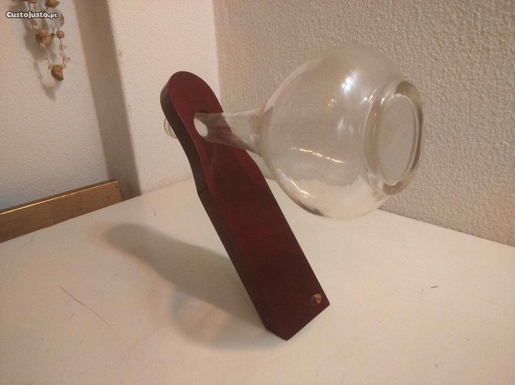 Todo em madeira. Permite equilibrar uma garrafa normal de 75cl cheia.