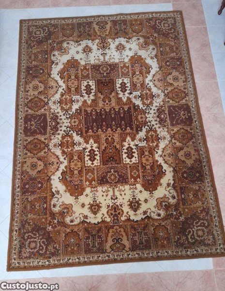 Estilo Oriental, tradicional - Carpete castanha com tons castanho escuro, castanho claro, beje, creme e preto - 2,305 metros de comprimento e 1,63 metros de largura. Preço: 100EUR