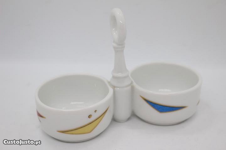 Especieiro ou saleiro com ramo de motivos geométricos a azul, amarelo e rosa contornados a ouro pega alta estilizada muito original