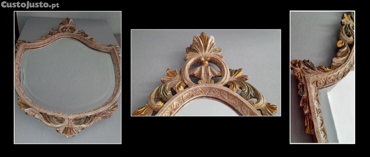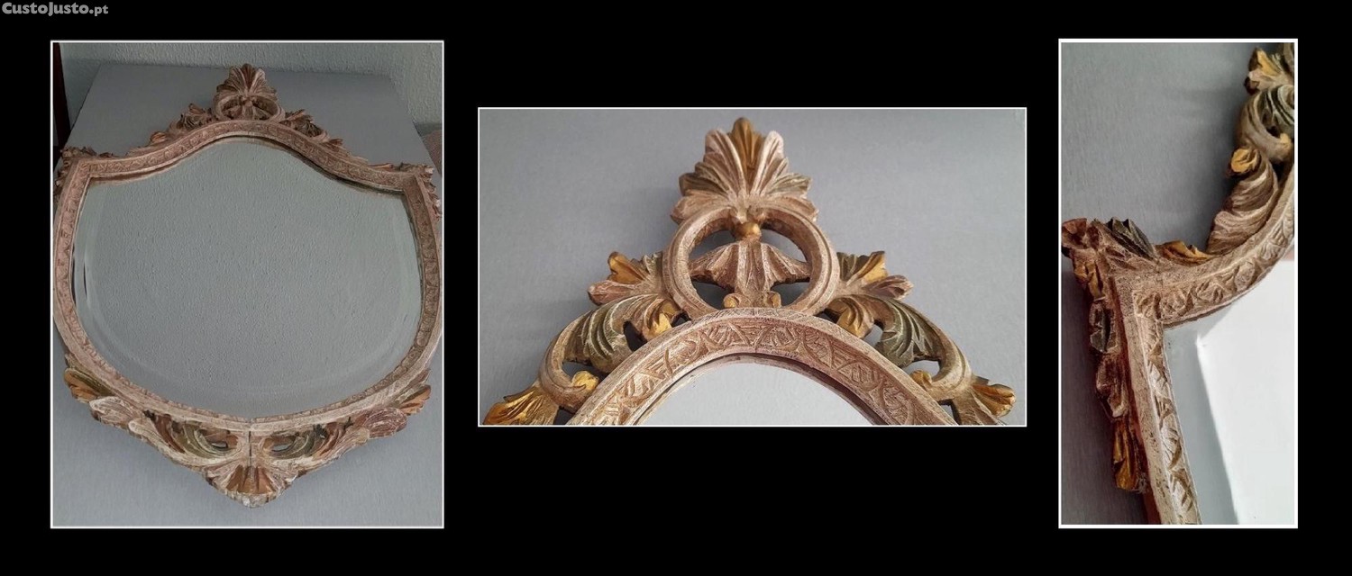 Espelho, com moldura em madeira carvalho, acabamento em dourado envelhecido, com suporte para pendurar na parede, C95 x L56cm, grande efeito decorativo, muito estimado.