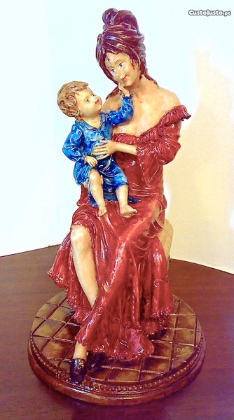 Estatueta de figura de "Mãe Meiga" com o seu filho, em marfinite. Pintada à mão com muito pormenor. Tem 30 cm.