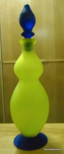 Garrafa artística, manual, aberta à mão, em vidro fosco amarelo/azul, da Marinha Grande. Altura 36cm.