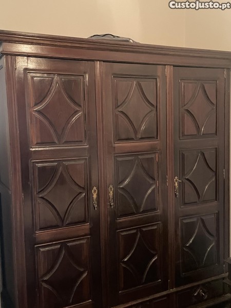 Guarda Fatos castanho escuro, quase preto, com 3 portas e 3 gavetas em baixo, com espelho por dentro na porta do meio, com +- 96 de comprimento e 190 de altura; levantamento em Paio Pires (Seixal)
