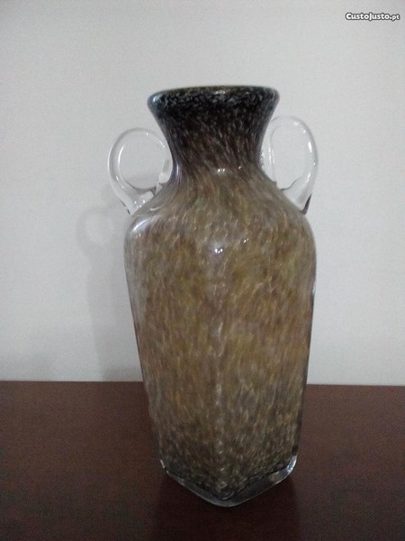 Jarra em vidro manual soprado, com base quadrangular com dotes castanhos e amarelos, fabricado na Marinha Grande. Diâmetro superior 12cm; Diâmetro da base 10x10cm e altura 38cm.
