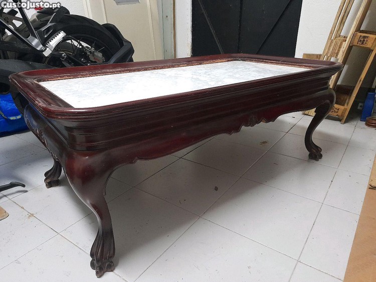 Mesa de centro de estilo da famosa e antiga marca Fehr, modelo 3072, série Albaran 6840. Mede 120 cm x 65 cm x 48 cm, tem pernas tortas com pés de garra e tampo de pedra mármore genuína de cor branca. É feita em madeira de faia maciça e escurecida em tom castanho. A pedra do tampo é de veio escolhido e por isso muito bonita. Está um pouco atacada por caruncho, a precisar de ir ao expurgo, por isso vendo barato. Para desocupar. Negociável, sai pela melhor oferta.