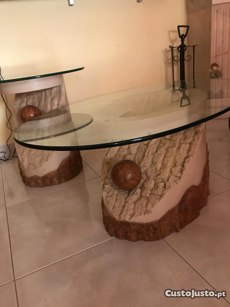 Preço: 230 €Mesa de centro e apoio em pedra e tampo de vidro