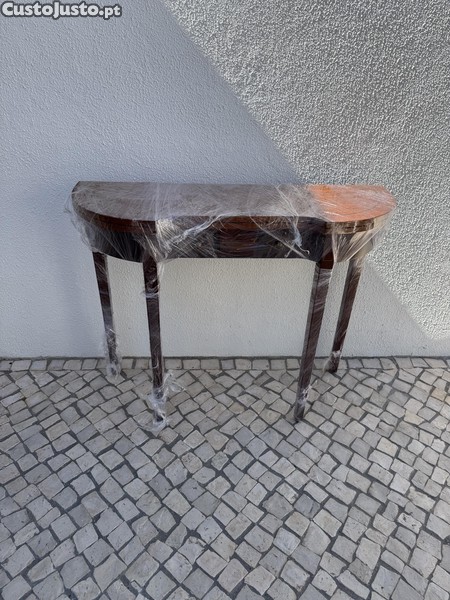 Mesa de entrada em madeira, com gaveta com puxadores dourados.