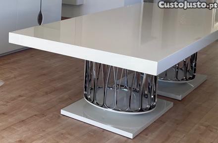 Mesa de 300 cm x 120 cm, modelo sofisticado e moderno. O seu tampo e as bases dos pés lacadas a branco com alto brilho proporciona um visual limpo e elegante, enquanto o pés em inox adicionam um toque de luxo. Ideal para refeições em grande estilo. Como novo.