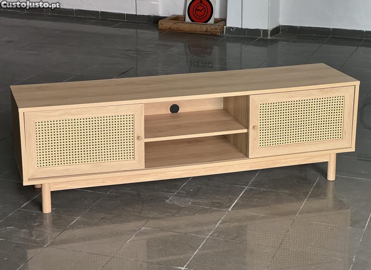Móvel de sala de estar em madeira clara, com portas de ráfia de deslizar e prateleiras para acomodar o seu televisor. Peça versátil e de design moderno, ideal para complementar a decoração da sua sala. De tampo tem 1.60X0.40cm e de altura tem 50cm.