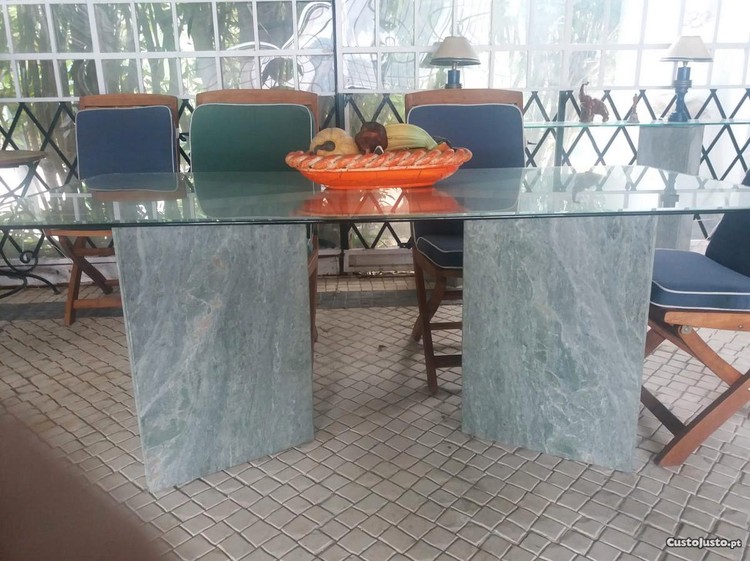 Mesa com suportes (pés) em pedra mármore verde e tampo de vidro de 1,80 m x 0,90 cm, com bisel .