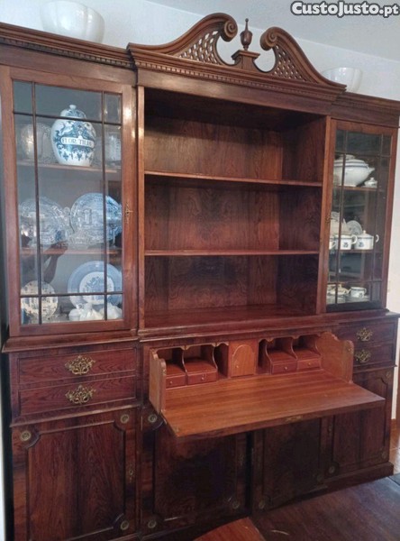 Móvel antigo de estilo clássico inglês, de uso versátil podendo ser usado como louceiro numa casa de jantar ou como estante/escrivaninha numa sala/escritório.