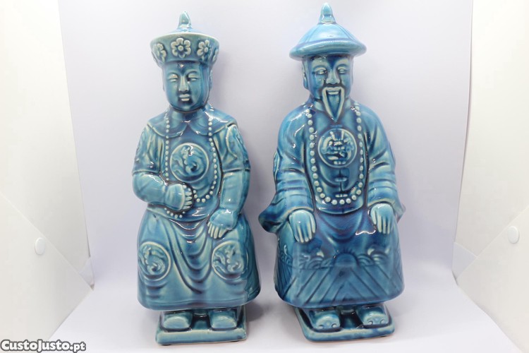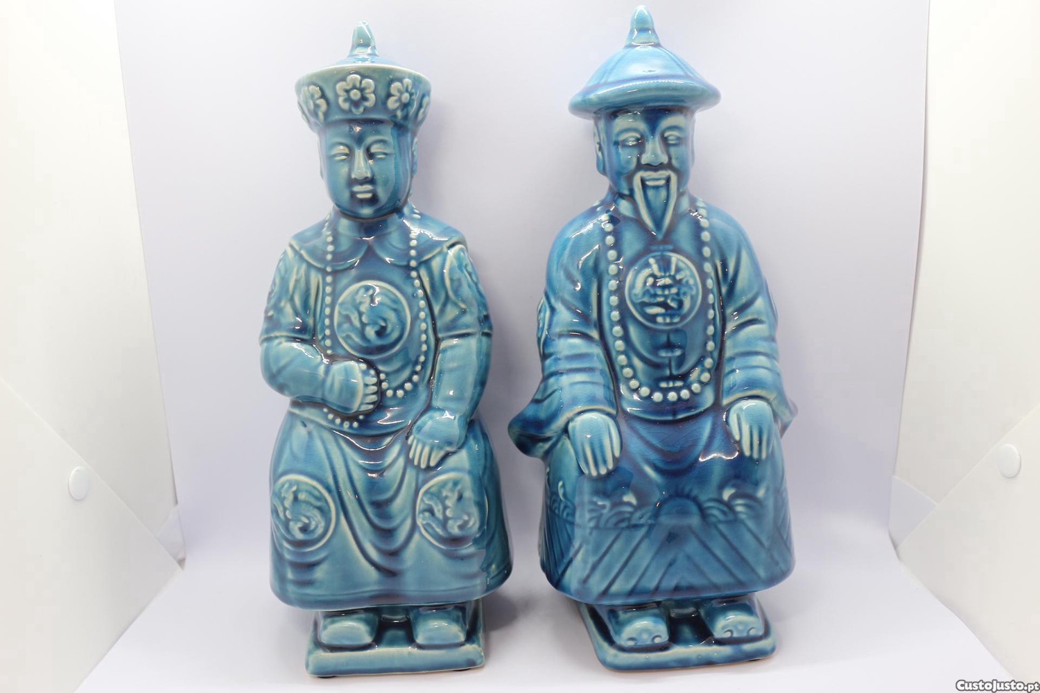 Par de Dignatários Esculturas Porcelana Chinesa Azul XX 30 cm