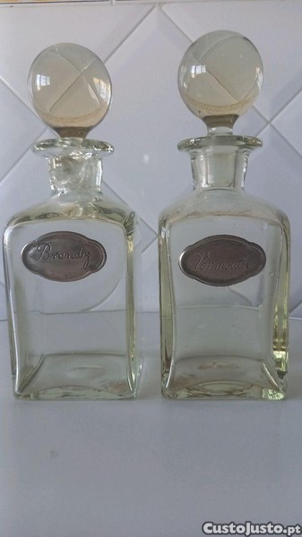 Par de garrafas de vidro antigas de bar, com placa de estanho referente às bebidas, apresentam 1 rolha e 1 gargalo partido, conforme 2 últimas fotos.
