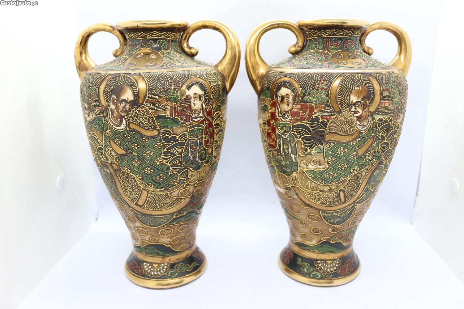 Par de Jarras antigas em Porcelana Japonesa Satsuma figuras e motivos nipónicos período Meiji marcada (1868 a 1912)