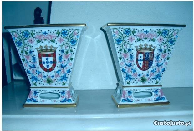 PAR de Vasos Convento em porcelana da Vista Alegre - Edição Limitada a 500 conjuntos.No IX Leilão Vista Alegre em 11/2009 apresentado com valores para licitação de 750,00-1125,00 e foi arrematado por 1500,00.Marcas: VA n36 (Entre 1980 a 1992).Ano de Fabrico: 0x/1986 (no certificado). Medidas: Alt.19cm x Larg.18cm x Prof.9,5cm.Notas: Com certificado da Vista Alegre nxxx datado de 0x/1986.Série Limitada (e numerada através do certificado) de 500 conjuntos para a comemoração dos 600 anos da batalha de Aljubarrota (1385-1985).Porcelana moldada. Decoração policromada "Armas de D. João I" e "Armas de Dona Filipa de Lencastre" com complementos a ouro, colocados à mão.