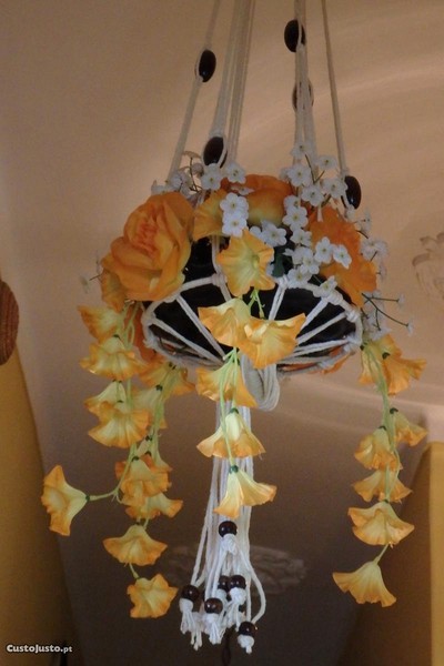 Prato de pendurar no tecto com flores artificiais impecáveis.