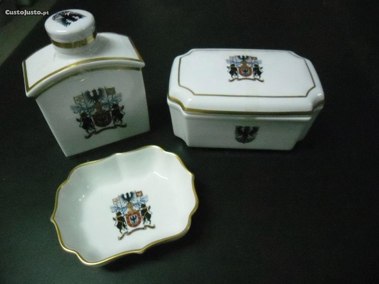 Conjunto de 3 peças porcelana com brasão de armas dos Açores, produzido pela Oficina Real (OR), nos anos 80, com o apoio do Governo Regional, numa edição limitada. Conjunto caixa (16x7x9cm), frasco tipo magalhães (9x13x5) e prato (12x10cm). 50EUR