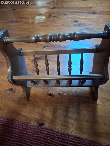 Porta revistas em madeira escura, envernizada, em ótimo estado de conservação. Tem as seguintes medidas: 45cm de comprimento; 45cm de altura; 23cm de largura. Entrego pessoalmente na Pontinha.