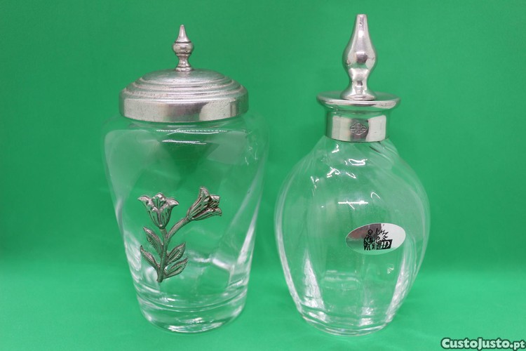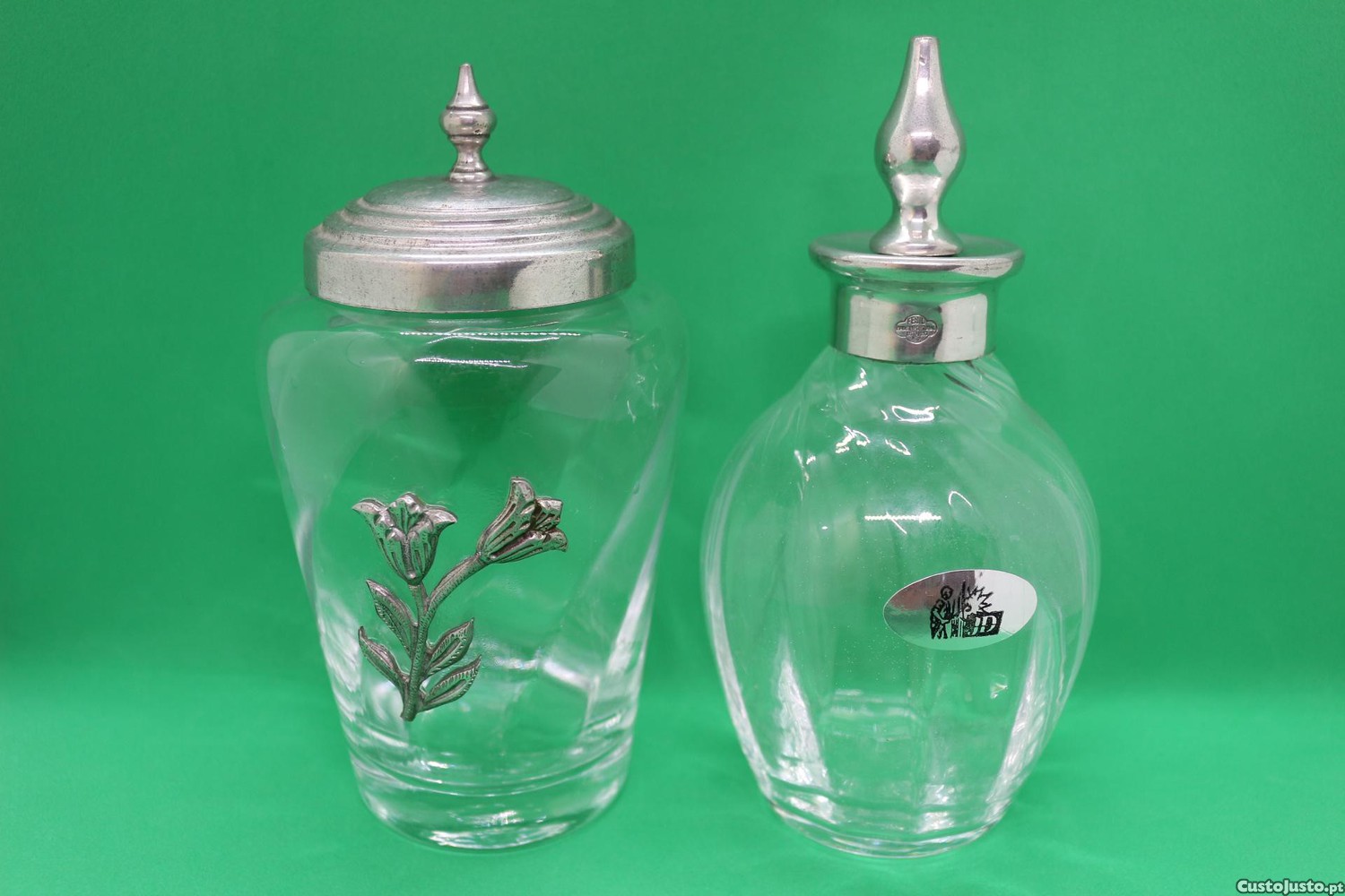 Pote e frasco em Vidro com tampas e Motivos em Estanho