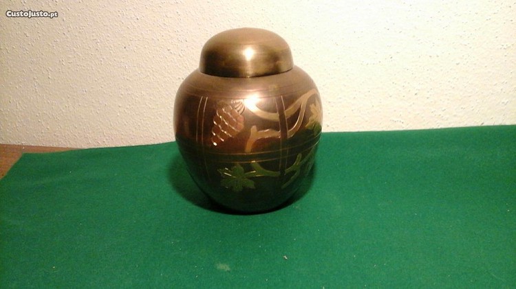 Caixa tipo pote em aço martelado com tampa em estado impecável, com motivos vinícolas, parras e uvas, com tampa.