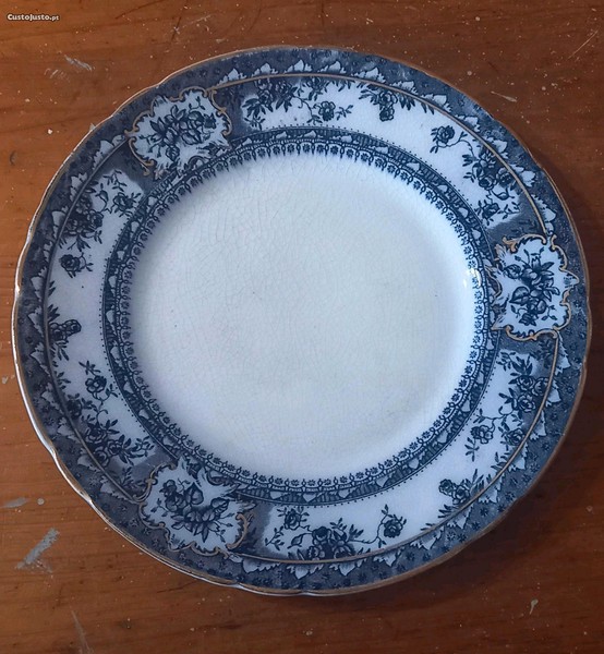 Prato raso em faiança Sacavém Gilman & Co., motivo Beira, azul forte com dourado.