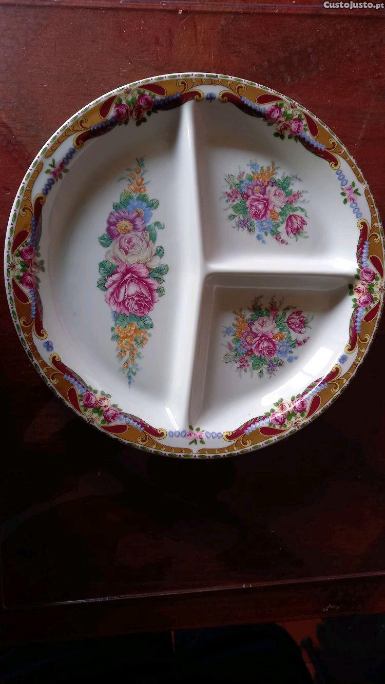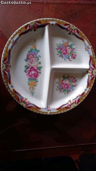 Prato de aperitivos em porcelana finamente decorada da Vizavi, decoração floral policromada pintada à mão com friso dourado, com selo da marca na base.
