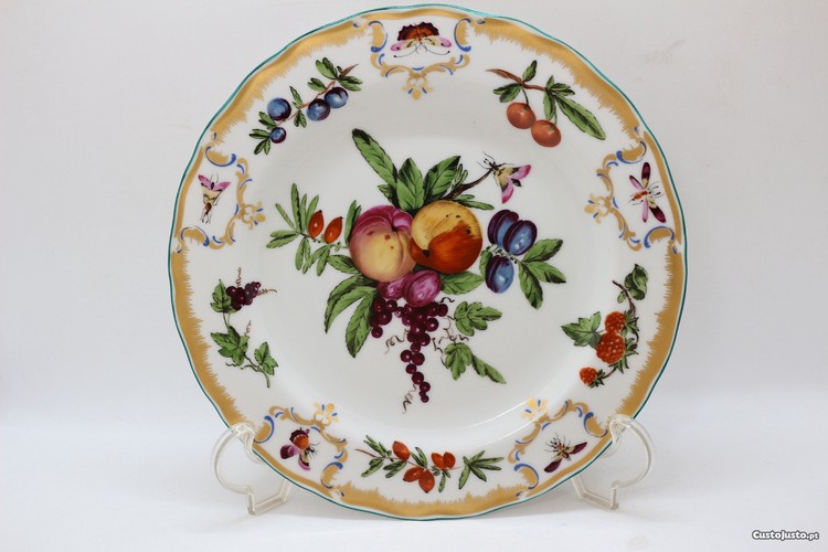 Coleção Duque of Gloucester é topo de gama da Vista Alegre equivalente a preços de folha de tabaco (133eur). Decoração coberta com várias frutas e borboletas, com remate a pinceladas a ouro e bordo verde.