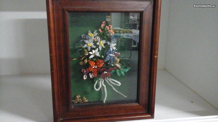 Quadro caixa em madeira e vidro. Feito à mão com missangas.