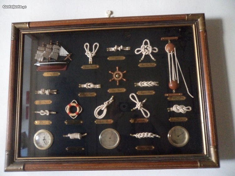 Quadro com nós de marinheiro, com 45/60 cm, tem relógio, termómetro e higrómetro (medidor de humidade).