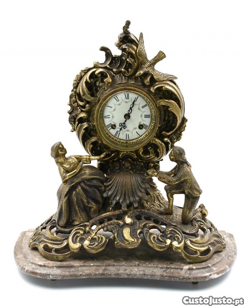 Relógio de mesa francês, estilo Rococó, em bronze. Mostrador com numeração romana. Assente sobre base de mármore. Possivelmente século XIX.