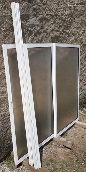 Resguardo de banheira ou poliban com 1900 mm larg. x 1480 mm de altura, em perfil de alumínio lacado a branco, ( 2 folhas ) forrado a acrílico incolor, com pormenor de gota de água, em excelente estado de conservação.