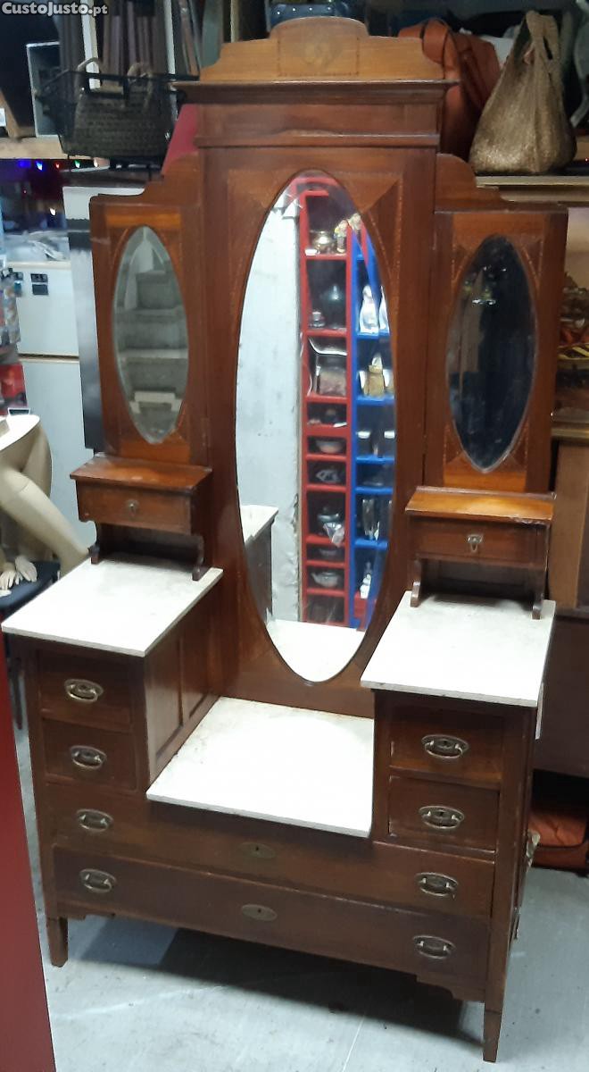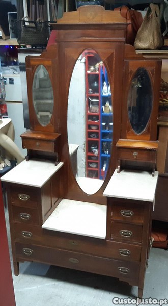 Com duas gavetas grandes, quatro médias e duas pequenas sobre os espelhos pequenos (ajustáveis). Três pedras mármore. Espelhos ovais de origem, apresentam algumas marcas.