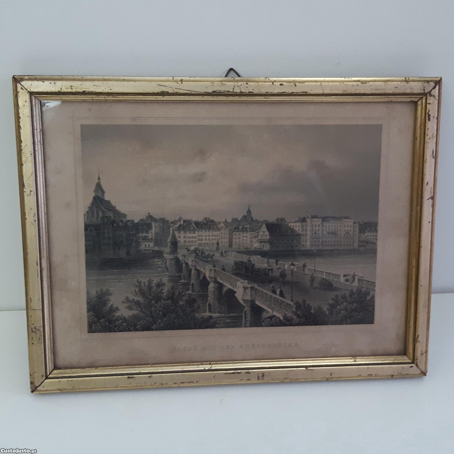 Retro Vintage Antigo Quadro Moldura Dourada Gravura Ponte do Meio Basileia