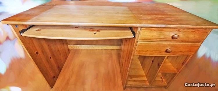 Excelente secretária em madeira maciça, pinho mel, em óptimo estado, em termos de estrutura, mas o verniz do tampo encontra-se danificado, com necessidade de envernizamento.