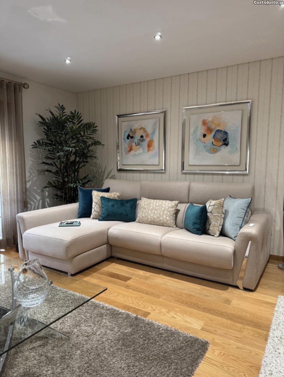 Sofá com chaise longue. Novo sem uso com arrumação e impermeabilizado. Tecido de peruca cor pérola. Localização do sofá, Carcavelos. Casa de Férias. Poderão experimentar o sofá mediante visita ao local. Medidas em anexo