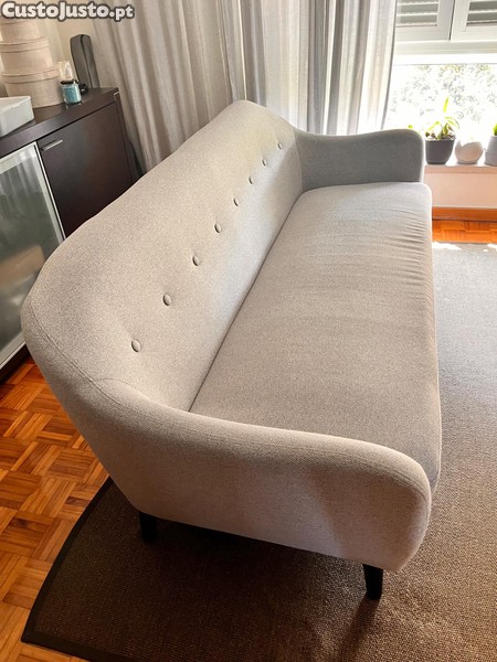 Sofá em tecido cinza claro, com 4 anos da ÁREA. Motivo da venda é pela necessidade de um sofá maior.