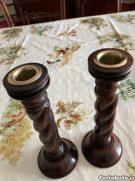 Dois suportes de vela em madeira, com o encaixe em latão, em óptimo estado.