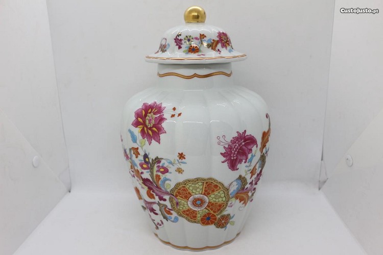 Talha bojuda lobulada com tampa com motivos florais tons rosa laranja verde e dourados, com contornos a ouro. A Coleção Dinastia Rosa teve origem na decoração da porcelana chinesa