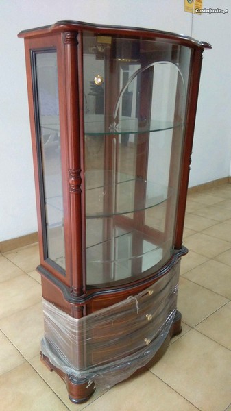 Vitrine em mogno com porta, prateleiras e laterais, tudo em vidro.