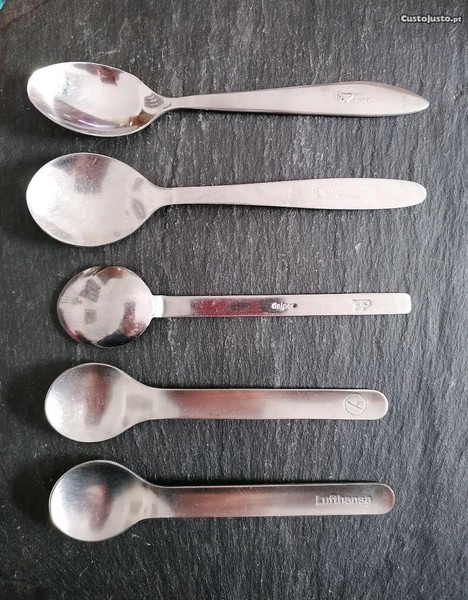 5 colheres em inox para chá ou sobremesa com a gravação de algumas companhias aéreas.