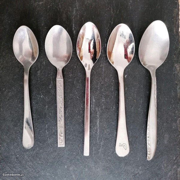 5 colheres em inox para chá ou sobremesa, sendo todas diferentes.