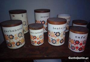 Conjunto de 8 recipientes vintage, com tampas em madeira, para açúcar, arroz, café etc. ( falta tampa num deles).