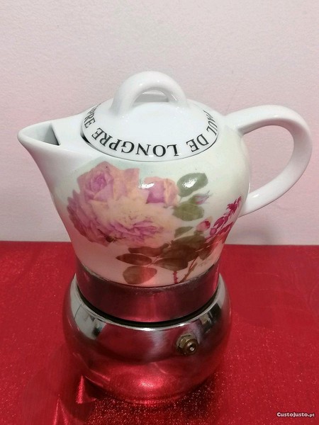Cafeteira com base em inox e bule em cêramica, com decoração do pintor francês Paul de Longpre