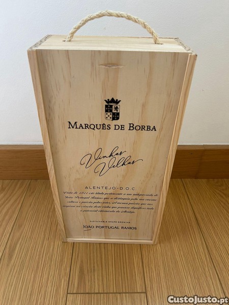 Caixa de madeira para armazenar garrafas de vinho da marca Marques de Borba, uma renomada vinícola da região do Alentejo, em Portugal. A caixa possui um design elegante e rústico, com alça de corda para facilitar o transporte. Ideal para presentear ou para guardar sua coleção de vinhos.